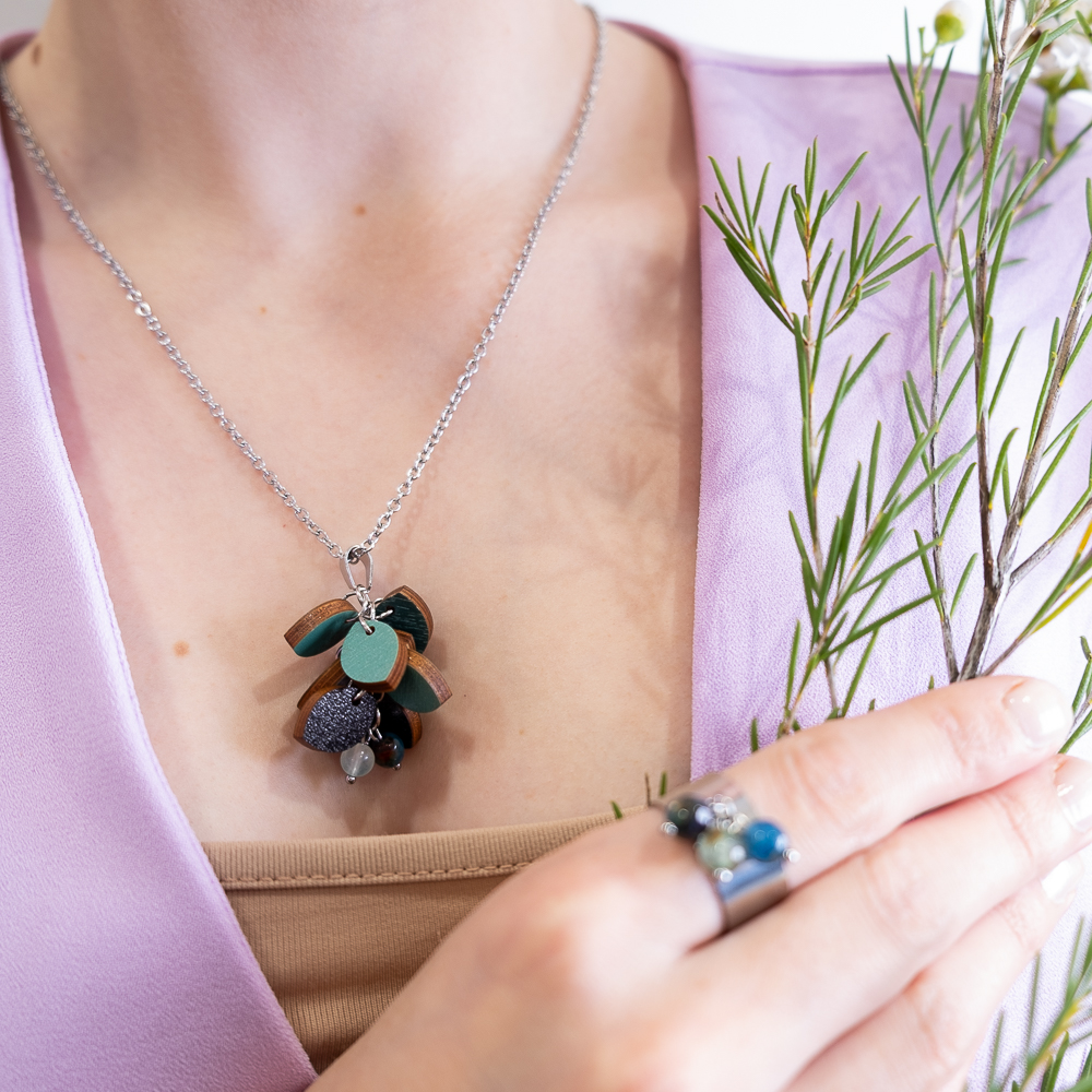 Valmistus: Puuosat laserleikataan Suomessa. Korujen kasaaminen on suomalaista käsityötä, josta vastaa Santra itse sekä hänen alihankkijansa Suomessa.