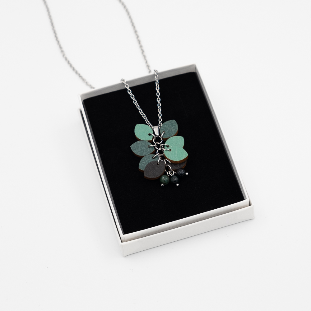 Sertifioitu suomalainen koivuvaneri, luonnon kivihelmet sekä kirurginteräs, joka on allergiaystävällinen materiaali. Korun väri on printattu korun pintaan. Saat korusi kauniissa korurasiassa, jonka mukana ovat hoito-ohje sekä materiaalitiedot.